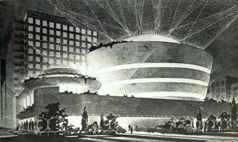 Wright had proposed a similar ziggurat design in 1924 for the Gordon Strong Planetarium in Maryland, which was not built. For the Guggenheim, though, the shape has been inverted, opening up toward the cosmos to allow a larger area for the domed skylight to fill the interior with natural light. Wright's design is similar to Erich Mendelsohn's fantastic sketch of 1920 for a pleasure pavilion (figure 11); he may have been aware of expressionistic architectural possibilities due to Mendelsohn's 1924 visit to Taliesin.