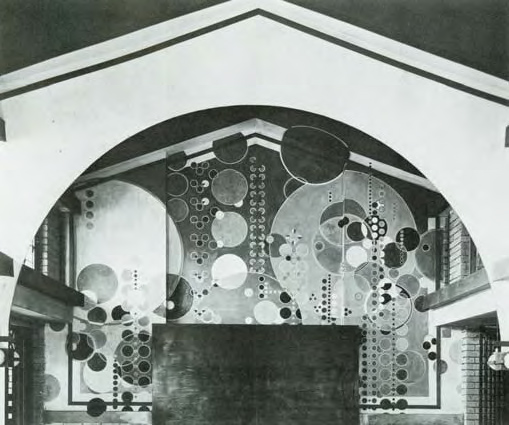 Theosophy's primacy of primary geometric forms as regulators of the universe together with his exposure to the Russian avant-garde artists such as Kazimir Malevich and El Lisstizky in Moscow must have been the cause of the radical shift in his work from expressionism to non-objective art. He later moved to Berlin to settle at the Bauhaus in 1923, where he remained for the next decade. Kandinsky's work (figure 8) from this period is much more similar to Wright's Midway Garden murals than to his own work of 1914, suggesting a possible influence from the 1921 Wendingen publication.