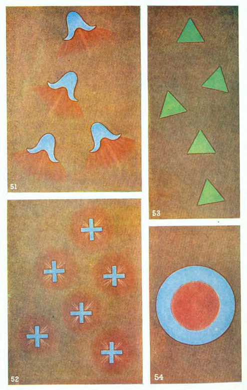 Malevich equated feeling directly with the non-objective square,[37] for example, Malevich's 1915 Color Masses in the Fourth Dimension, which depicts an orthogonal black square and a rotated red square. Perception of the fourth dimension was not of the surface of the canvas itself, but in the imagination of the beholder while mentally rotating the forms in the mind's eye. The notion that feeling could be visualized using non-representational geometric forms had been illustrated over a decade earlier by the Theosophists Annie Besant and Charles Leadbeater in their Thought Forms of 1901 (figure 9).