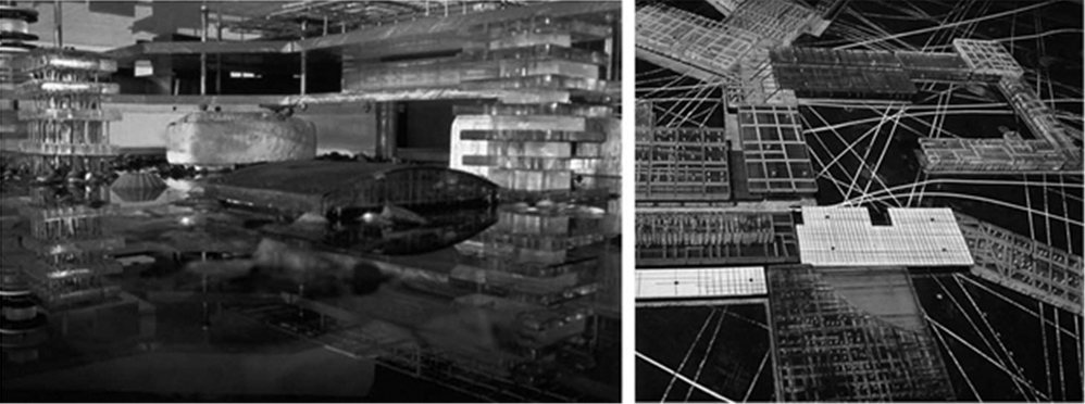 While the first true automobile may have been invented in Europe, the first large-scale production of automobiles in America was by Ransom Olds in 1902. By 1914, Henry Ford's production methods made the car affordable to the general population, dramatically altering the way cities were conceived. No longer grounded as either points at intersections of commerce or as points on a grid, futuristic cities were being imagined by visionaries like Moses King as four-dimensional spaces of flows defined by modes of transportation both horizontally and vertically, differentiated by rates of speed from pedestrian to automobile, train and airplane (figure 1). Within this layering of transit mobility, multivalent layers of communications technology were also being considered by architects as a means to guide the planning of cities on a global scale.