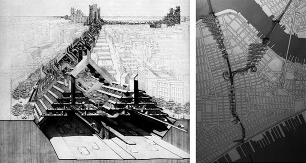 Figure 3. Paul Rudolph, Lower Manhattan Expressway, project, New York City, 1967-72. From this entrance near the Holland Tunnel, the Brooklyn and Williamsburg Bridges can be seen beyond.
